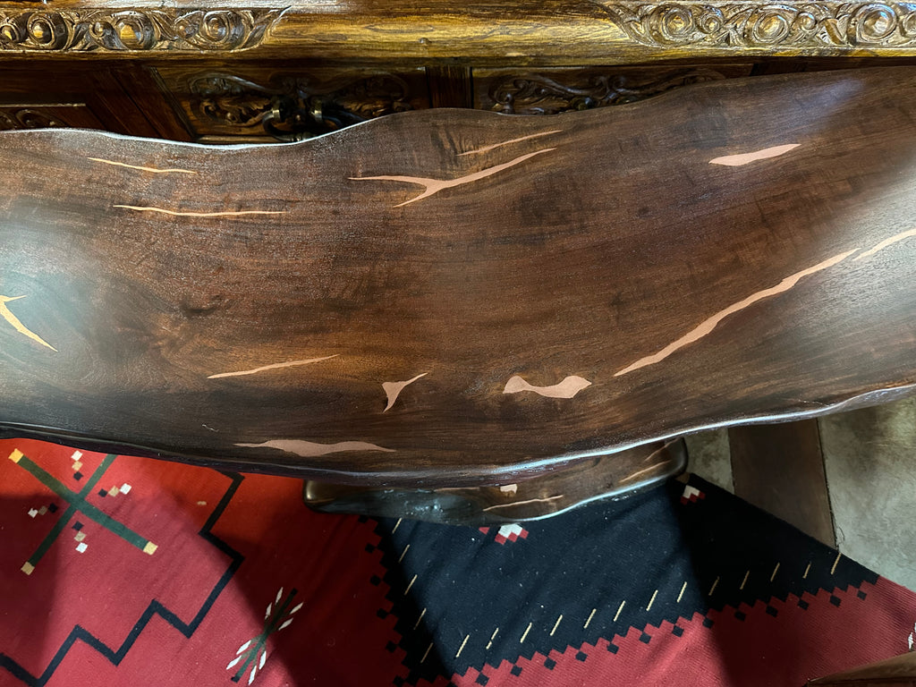 Beautiful Live Edge Sofa Table with Copper inlay dark stain finish with trunk base. Handmade in Mexico.