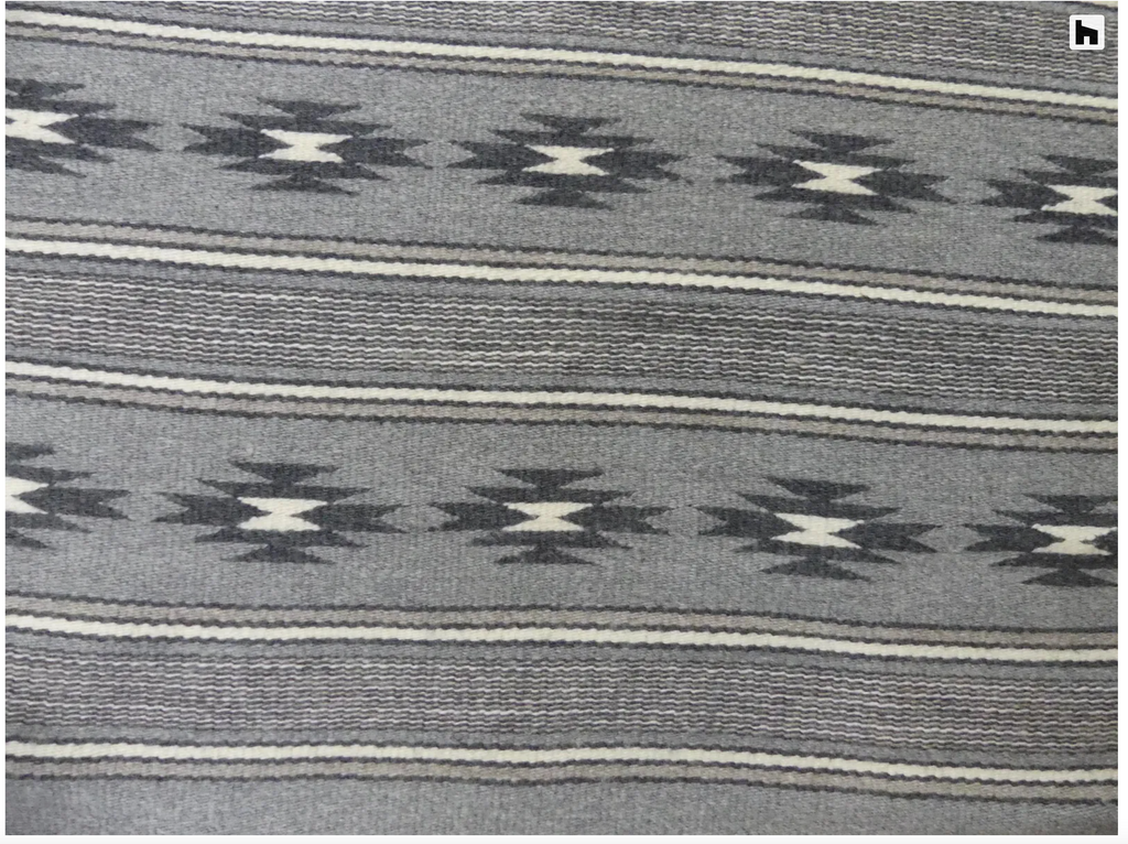 This 42" x 28" Navajo rug, crafted by renowned weaver Corinna Harrison and sold at Arizona's Cameron Trading Post, showcases a vintage and meticulously woven design.Handwoven with natural colors ,it gives a gentle contrast in the pattern.Extremely fine weave.The wavy line is indicative in the region.