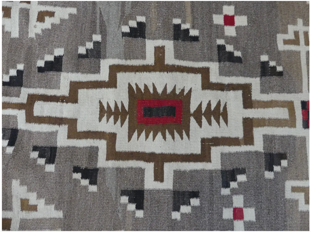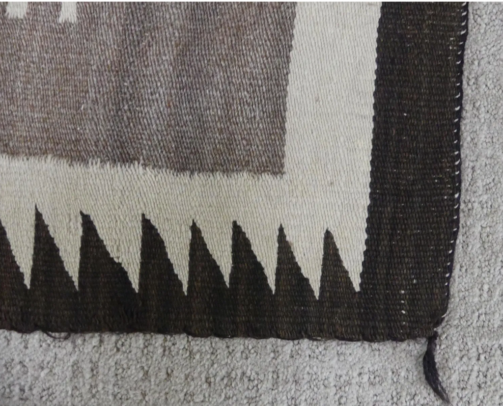 Handsome vintage Navajo rug in tan, black, and cream colors with 2 small red squares in center,