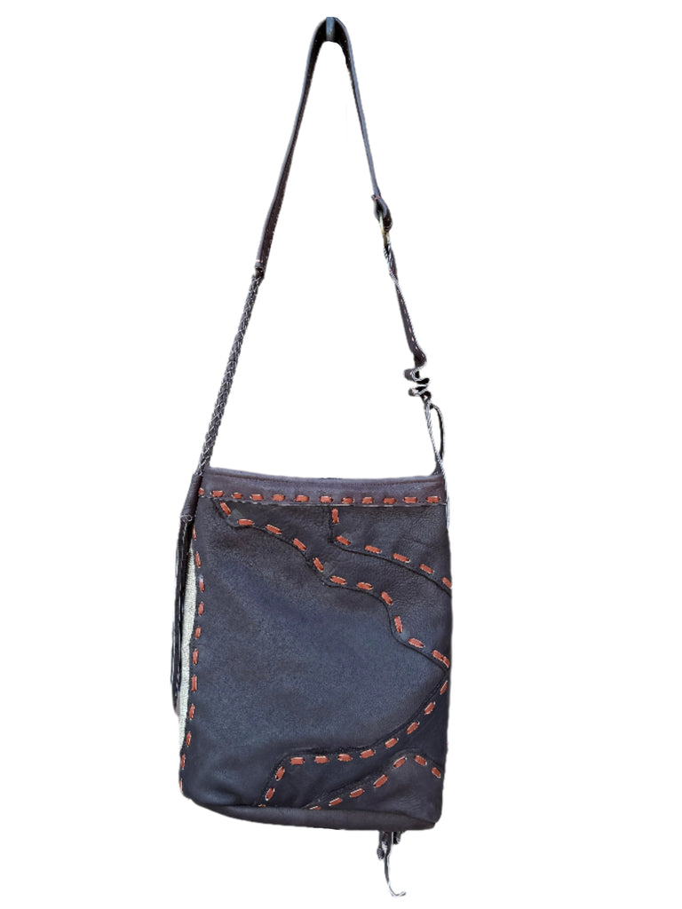 A richly textured shoulder bag made from an authentic Navajo rug, featuring adjustable leather straps and a soft cotton lining. Crafted with genuine leather and built for both function and style.