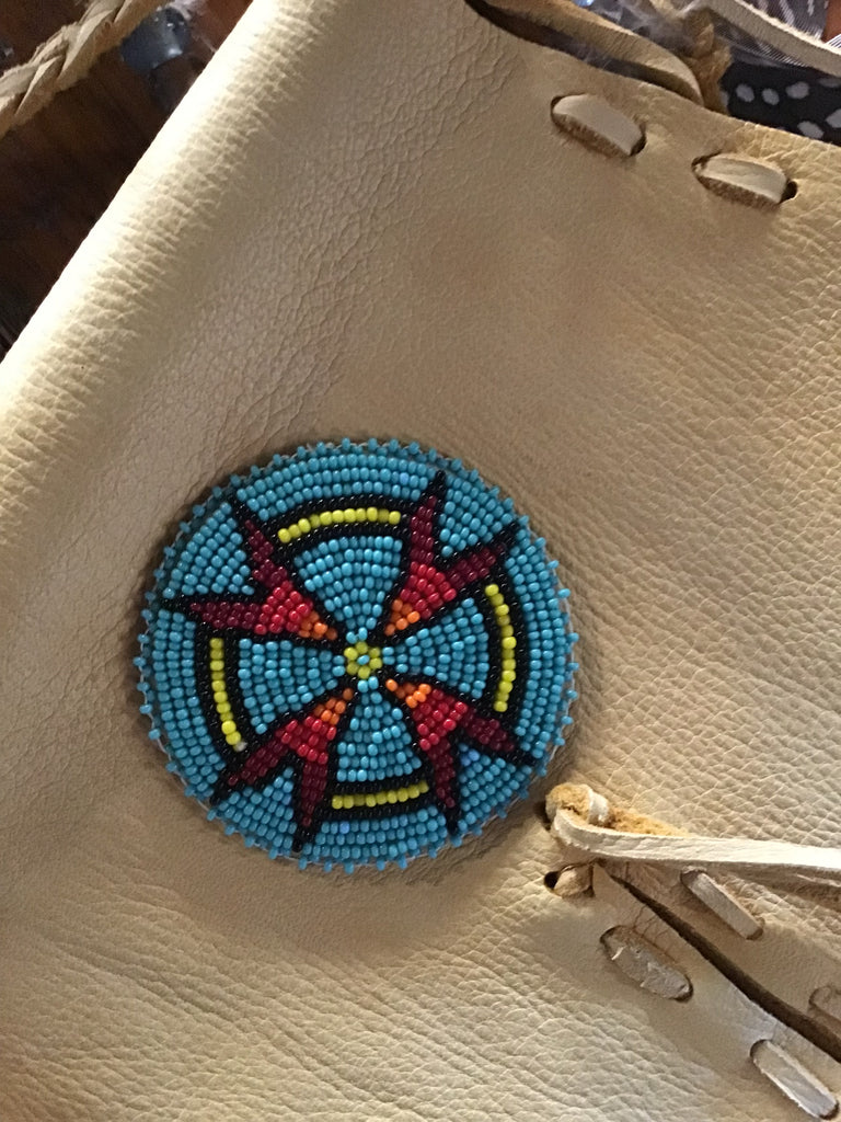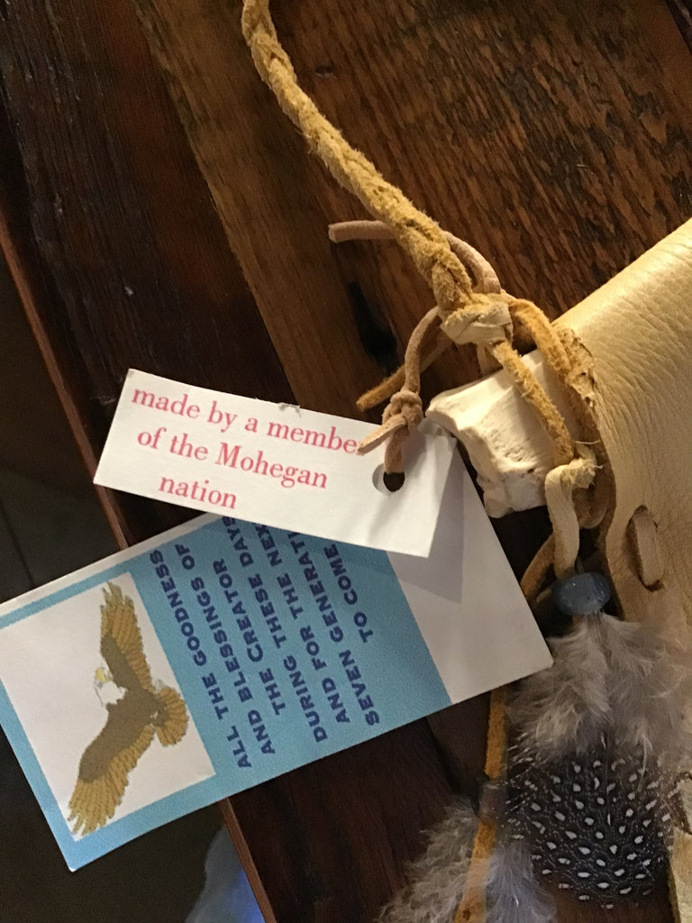 Made by a member of the Mohegan Nation. Beautifully handcrafted, with beads and feathers