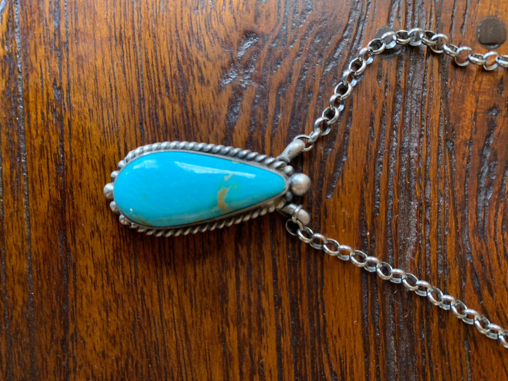 Silver necklace with a kingman turquoise by Navajo jeweler Elouise Kee. Stamped "STERLING" and "Elouise Kee".