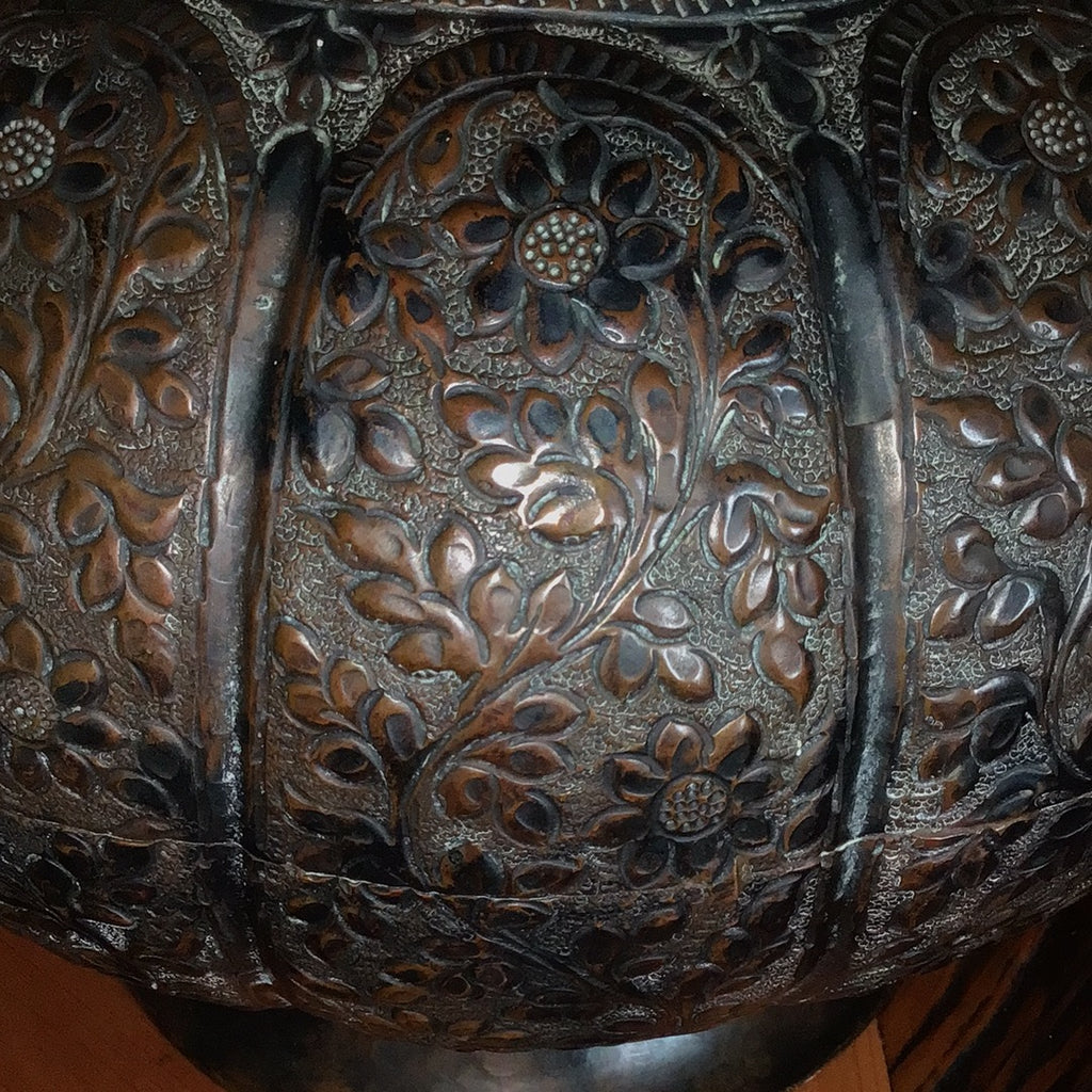 The Rustic Metal Lamp boasts a stunning design featuring intricate flower engravings and a base measuring 16 inches in height and 12 inches in width. With the accompanying lamp shade, the overall height of this piece stands at an impressive 2 1/2 feet.