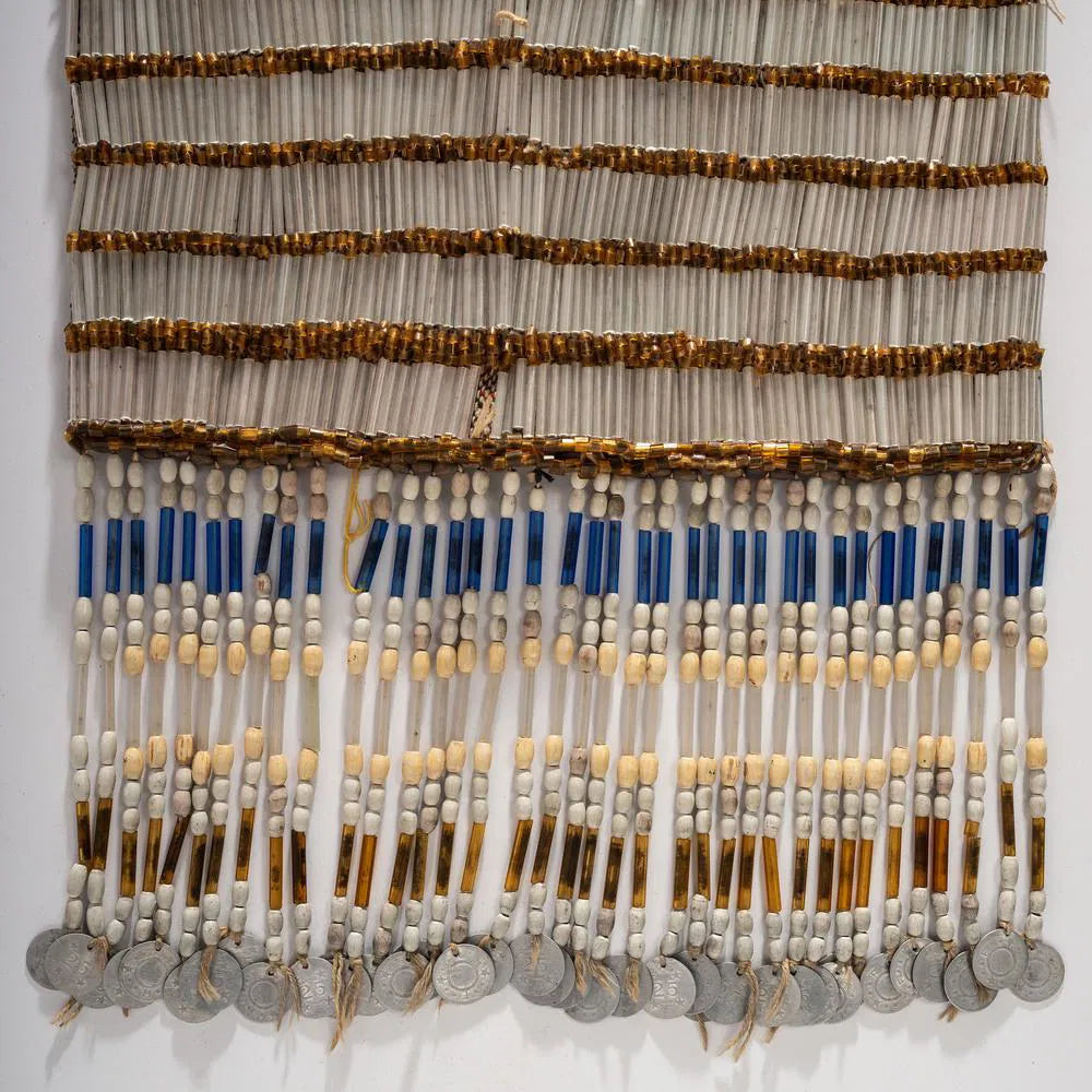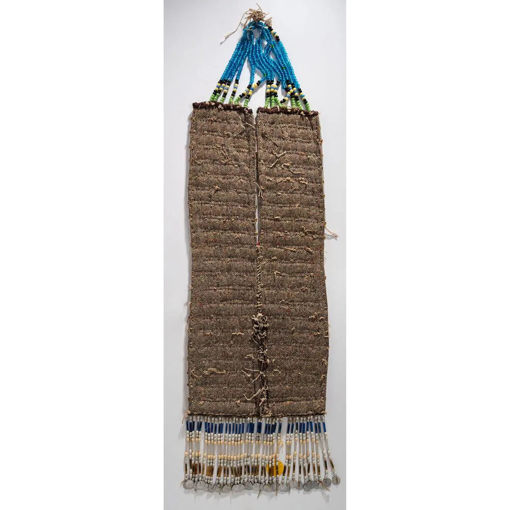 This amazing breastplate is made of bugle bead, backed with tweed woven fabric alternating between gold and opaque; beaded fringe terminating with tin tokens.
