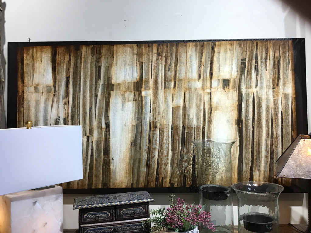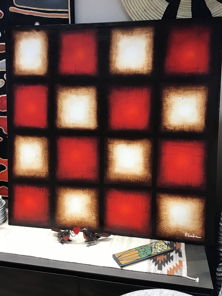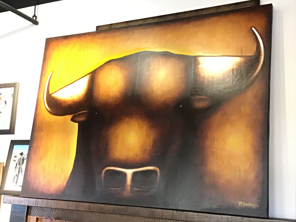 - Oil on canvas, 35x65 (approx), red abstract bull. By P. Leon, Ecuadorian artist.